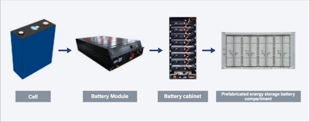 The Energy Storage System (ESS) adopts a modular architecture with a clear hierarchy of battery cells, modules, clusters, and fully integrated containerized systems. Each container is equipped with: